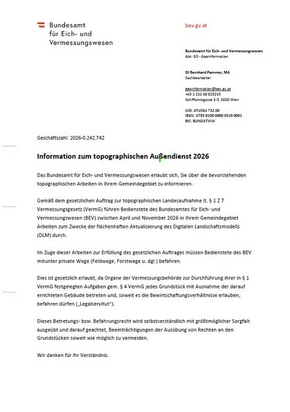 Das Bundesamt für Eich- und Vermessungswesen gibt bekannt, dass zwischen April & Oktober 2026 in unserem Gemeindegebiet topographische Arbeiten durchgeführt werden.